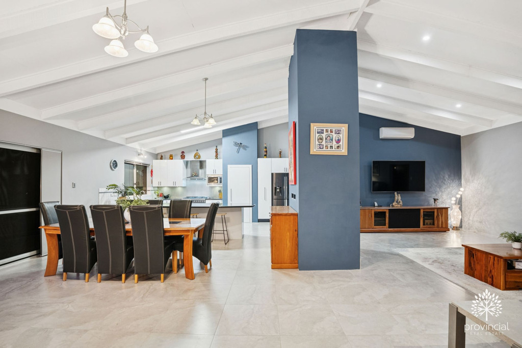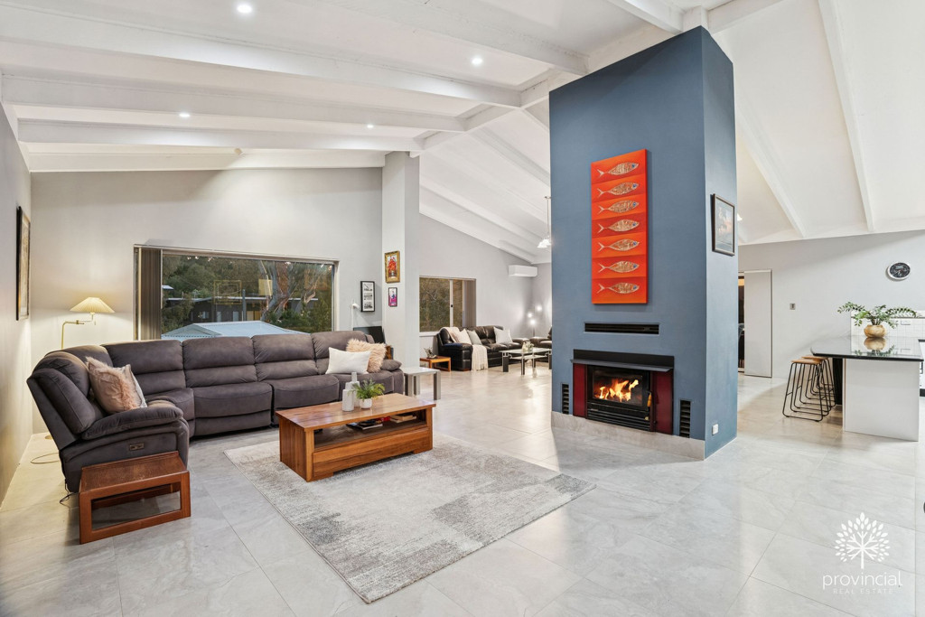 • Huge open-plan entertainers' kitchen, dining, living, and lounge area with soaring ceilings, wood fire, breathtaking views, large-format tiles, and two r/c split system units