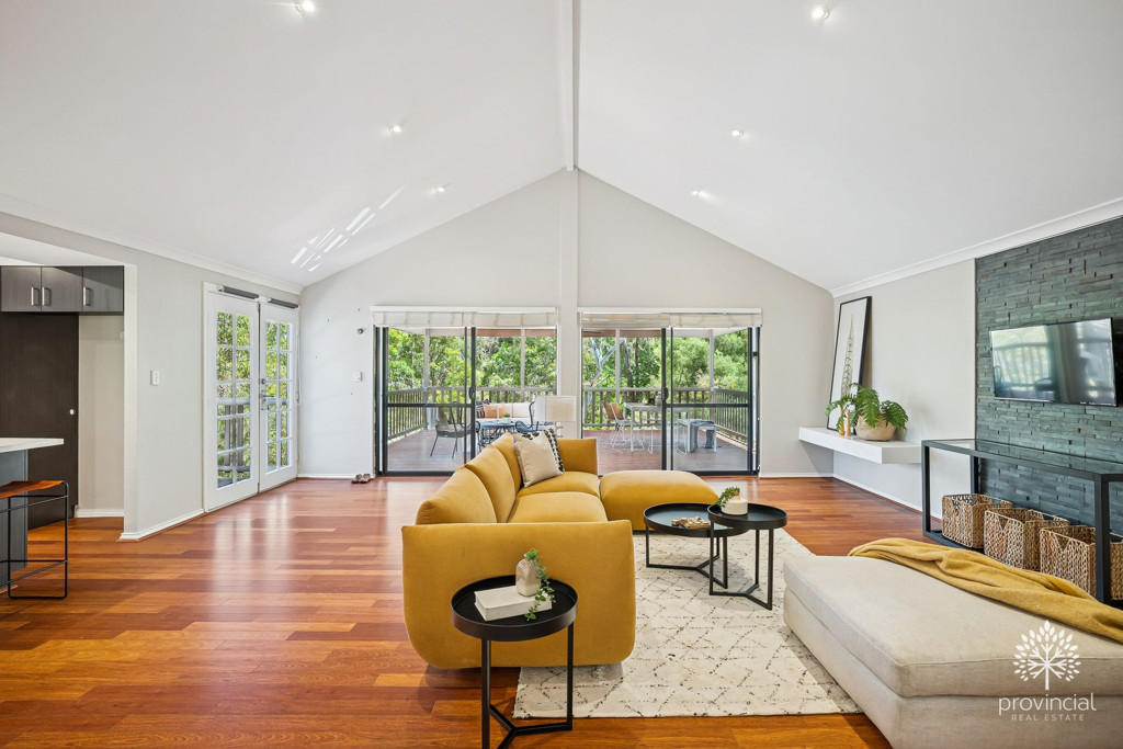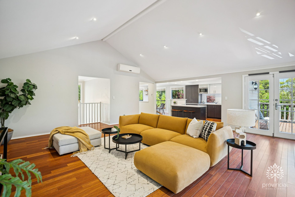 • Breathtaking open-plan living, dining and kitchen with soaring vaulted ceiling (opening onto the entertainer's deck), with r/c split system, and treetop aspects from every window