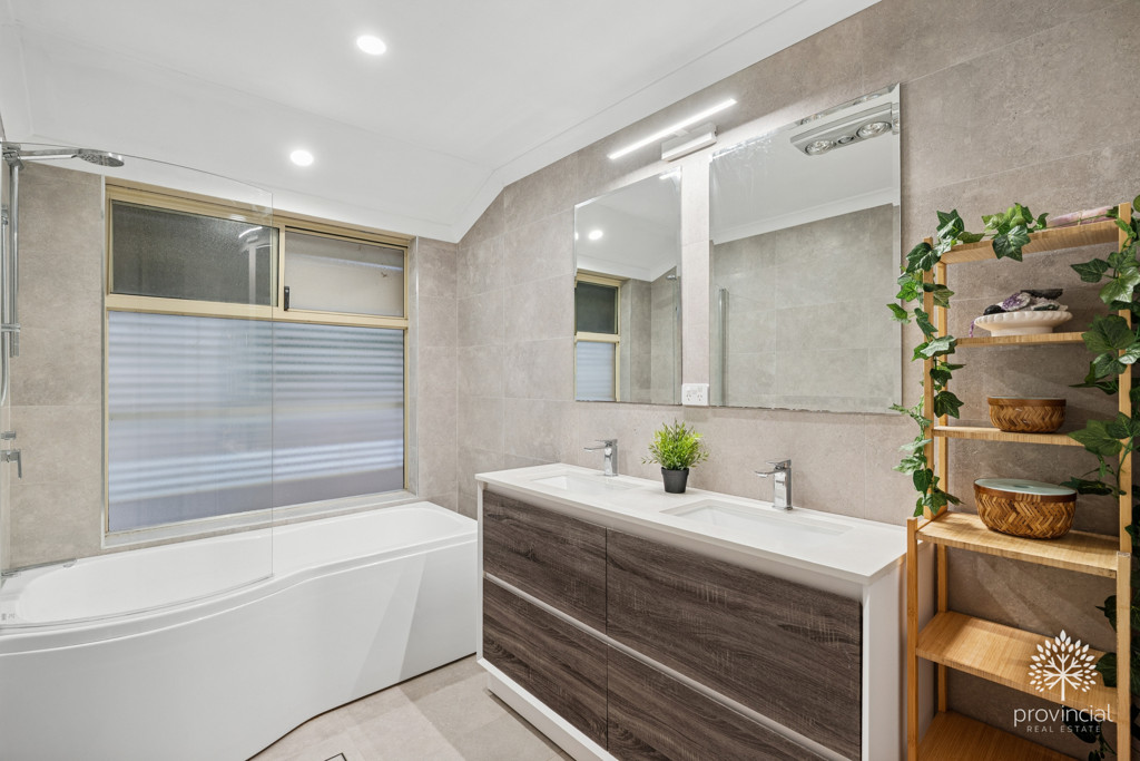 • Renovated family bathroom with large bath, dual vanity, and floor-to-ceiling large format tiles