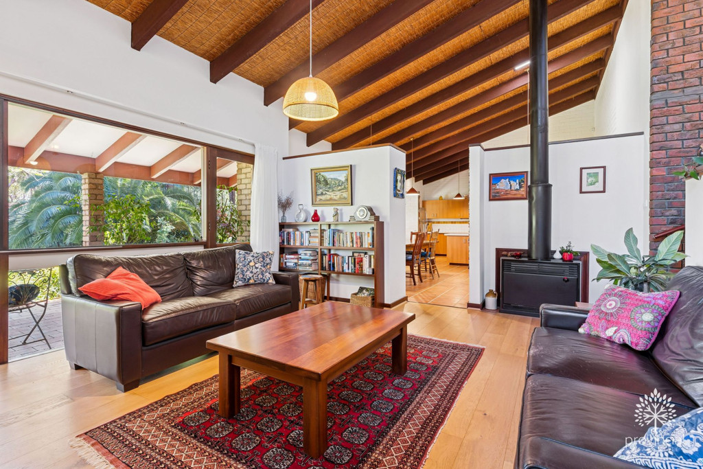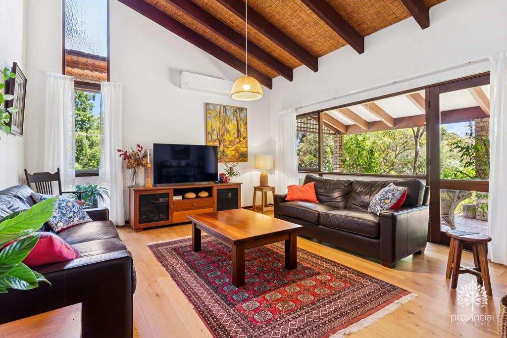 The home is definitely no cookie cutter design as it exudes what so many would expect from the quintessential hills home including super high raked ceilings, split level floor plan, double side wood heater and huge picture windows that take full advantage of the surrounding greenery and a bonus glimpse of the twinkling lights on the horizon.
