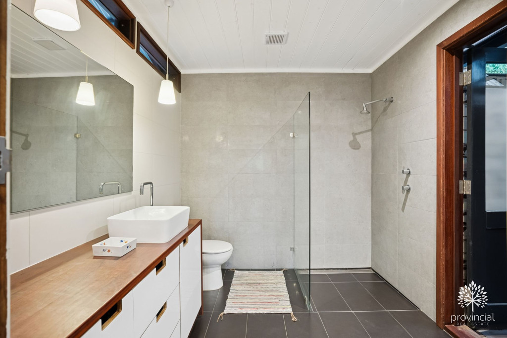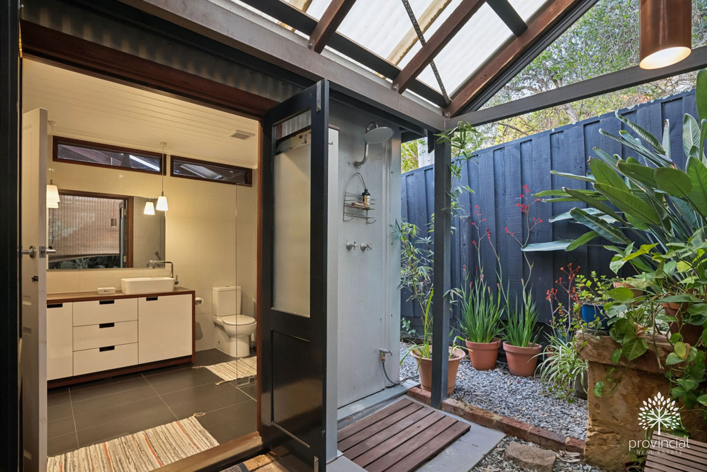 • Generous secondary bathroom with French doors opening onto a lush courtyard garden with outdoor open-air shower