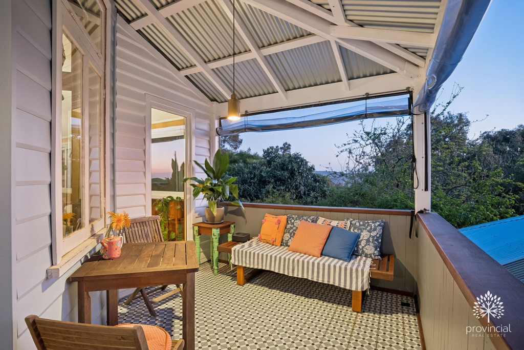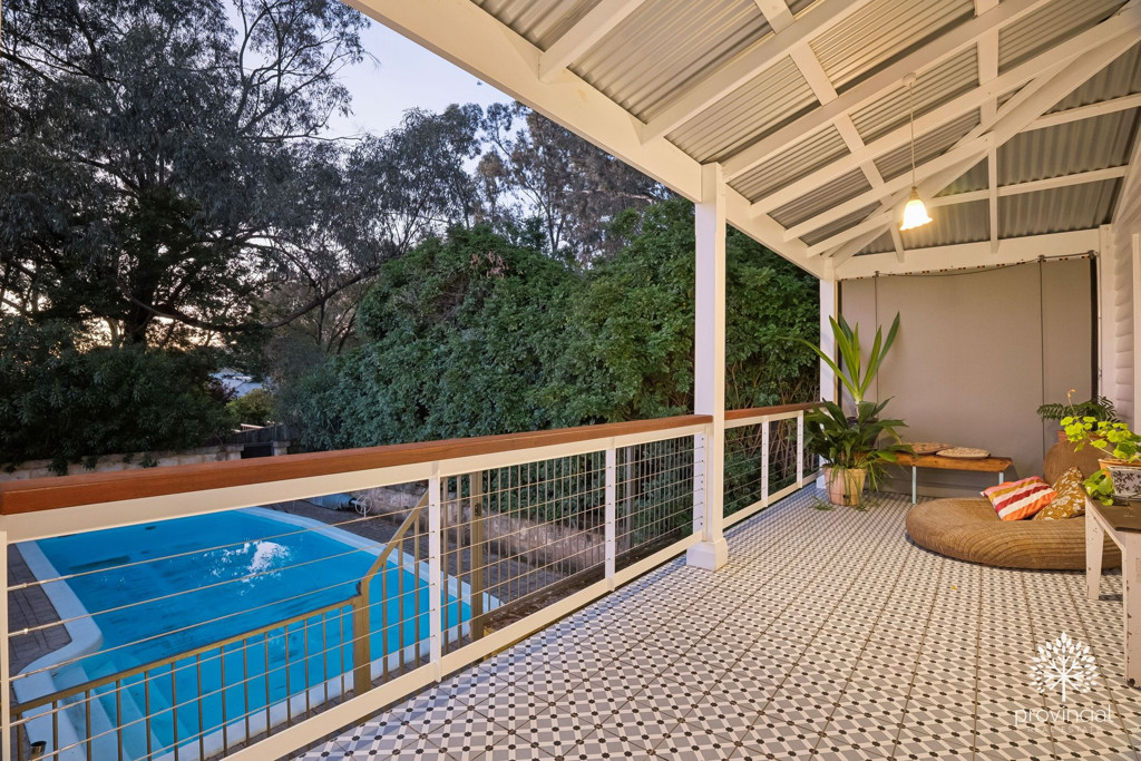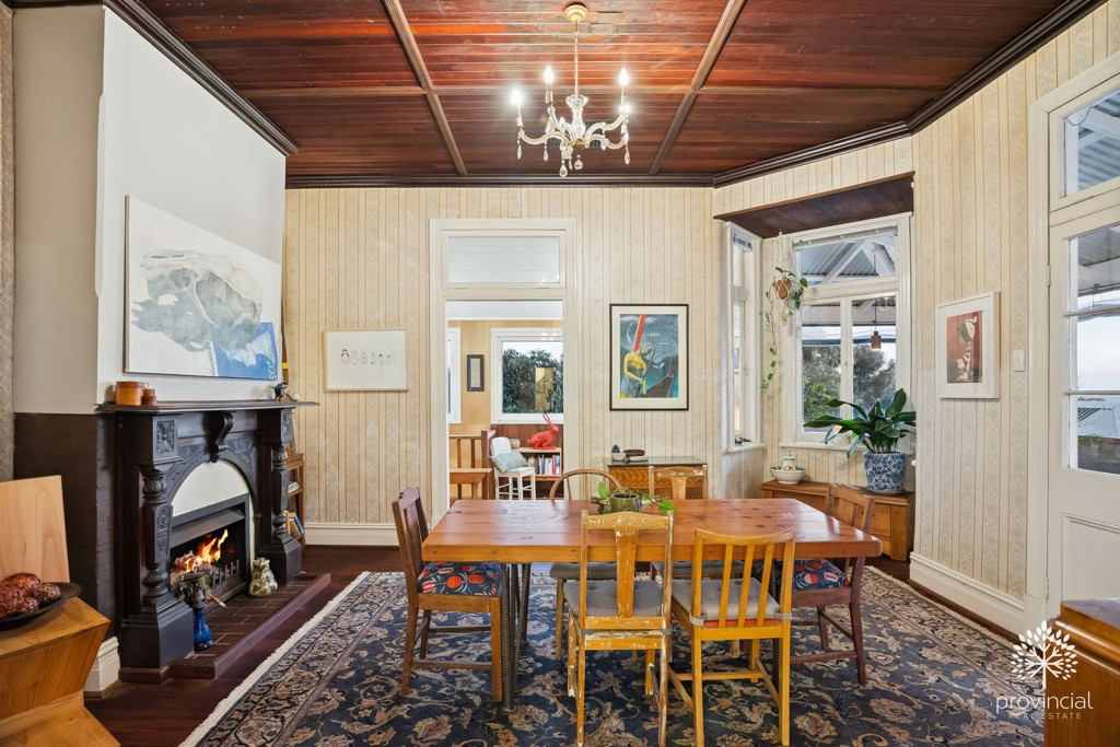 • Huge formal dining room with original Jarrah ceiling and floors, open fire with ornate mantle, and bay window with views of the twinkling city lights; opening onto the verandah through French doors